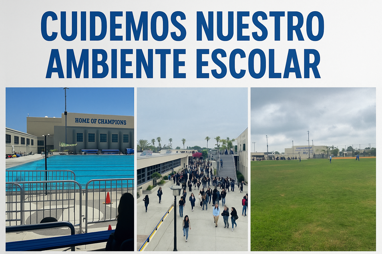 También si vemos más allá de la limpieza tenemos que observar que nosotros en ocasiones no respetamos y tiramos basura sabiendo que hay poco personal. Es comprensible que no siempre se pueda limpiar bien si hay clases todos los días, ya que el tiempo y el espacio son limitados. Por eso yo como estudiante de Anaheim High School, les propongo que cuidemos más de nuestra escuela como una familia que somos. Tenemos que estar unidos para proponernos respetar y cuidar de nuestro medio ambiente escolar.