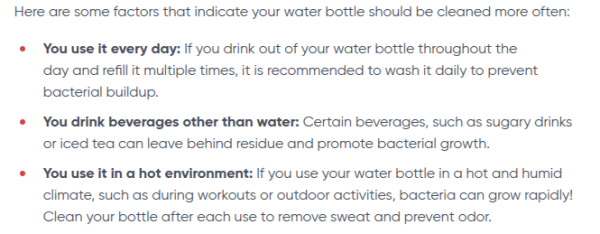 There’s not really a set time on how often you should clean it but more so on how you use it. Check to see if certain factors apply to you that require you to wash it that same day after use. For example, if there’s odor or spots of mold growing in your water bottle, that might be a sign that you HAVE to clean it. Experts like pediatricians and doctors recommend washing it every 2-3 days IF you only drink water from it, but if possible daily. At the very least it should be washed once a week. What are the benefits? You get fresh water that doesn’t taste funky, a water bottle that doesn’t smell, and you don’t get sick as often by the bacterial build up.
